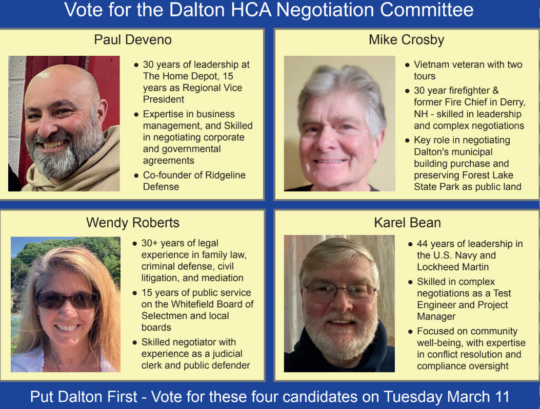 It began two years ago when a group of residents realized their voice & vote could make a difference and they chose to do what they could to save the Dalton Planning Board and the Dalton Conservation Commission. It was to come together with their unique skills and get the word out to residents on why they needed to vote to save these two groups. And so.... Dalton Voters for Democracy was created where in one voice they could come together for the benefit of all in Dalton!